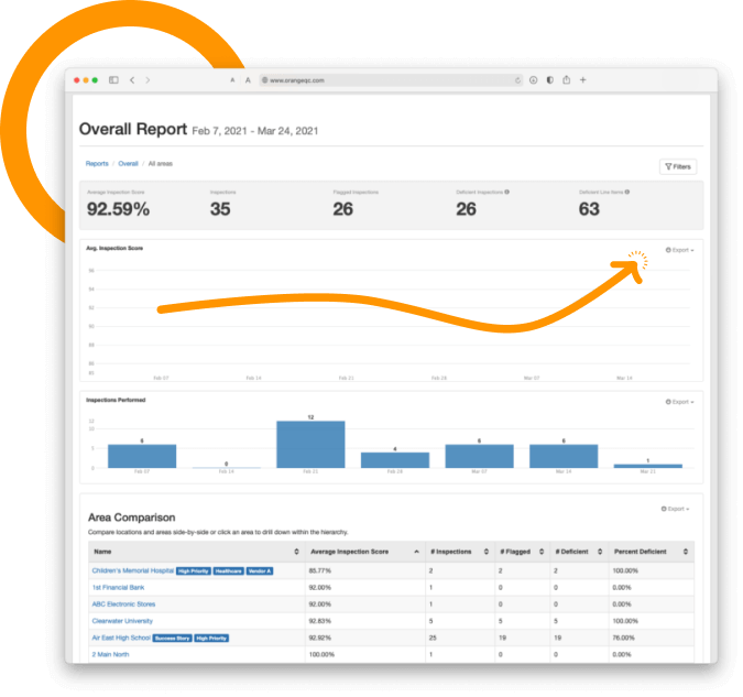 Powerful data reporting reveals trends at your facilities to help drive smarter business decisions. Our clients use the data from OrangeQC to train their custodial staff on under-performing line items, adjust staffing levels based on trends at the facility, catch problems before they damage client relationships, and win new business based on a proven record of results.