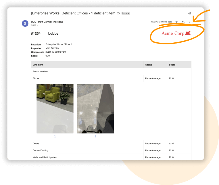 Your organization’s name and logo are front and center on communication through OrangeQC. From the login portal to your dashboard to PDF reports, it’s all about your team.