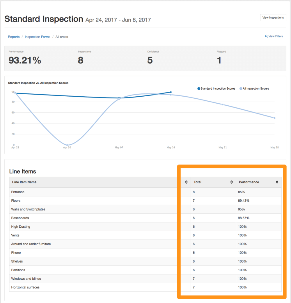 Our new inspection forms report (available under the Reports tab) lets you compare performance on individual inspection forms. The new reporting reveals things like “top 10 areas where Entrances scored the lowest.” Metrics for the individual line items within each form make it easier to spot your lowest-performing items to target for improvement. You can also see how a particular inspection form compares against your overall performance.