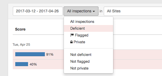 Inspections can now be filtered by Not Deficient, Not Flagged, and Not Private.