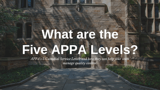The levels are a rating system designed to help educational facilities evaluate the cleaning quality at their facilities, as well as the appropriate staffing needed to maintain the clean. The APPA custodial service levels provide a clear framework for custodial and facilities teams to talk with their organizations about the level of clean expected, staffing levels, and more.