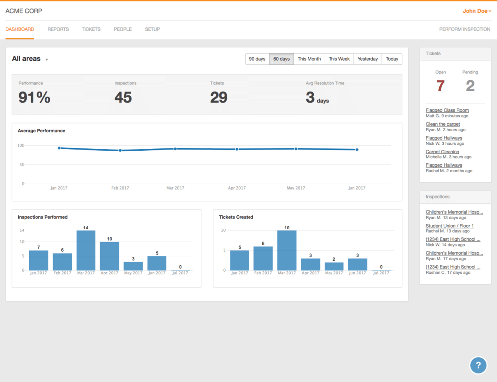 - Show off your data. Your dashboard lets you see your average inspections scores over time for each location, as well as how many inspections you’ve performed and how long it takes you to resolve a ticket on average. Share this data with your clients! They’ll feel confident knowing you track your own performance and keep an eye out for any issues.