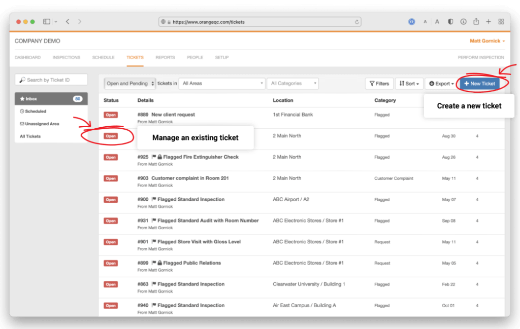 Use tickets on the OrangeQC mobile app, by email, through the web app, or even via scannable QR codes. Employees in the field and at the office can all access the tickets for their areas, so nothing gets lost in one person’s inbox. If you’d like, you can also grant full or partial access to your client or organization.