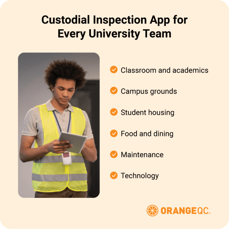 OrangeQC’s custodial inspection software for colleges and universities replaces old-fashioned clipboards and complicated software, empowering your custodial team to take photos, quickly rate areas, and track issues until they’re resolved. Track classroom readiness based on the needs of your organization.